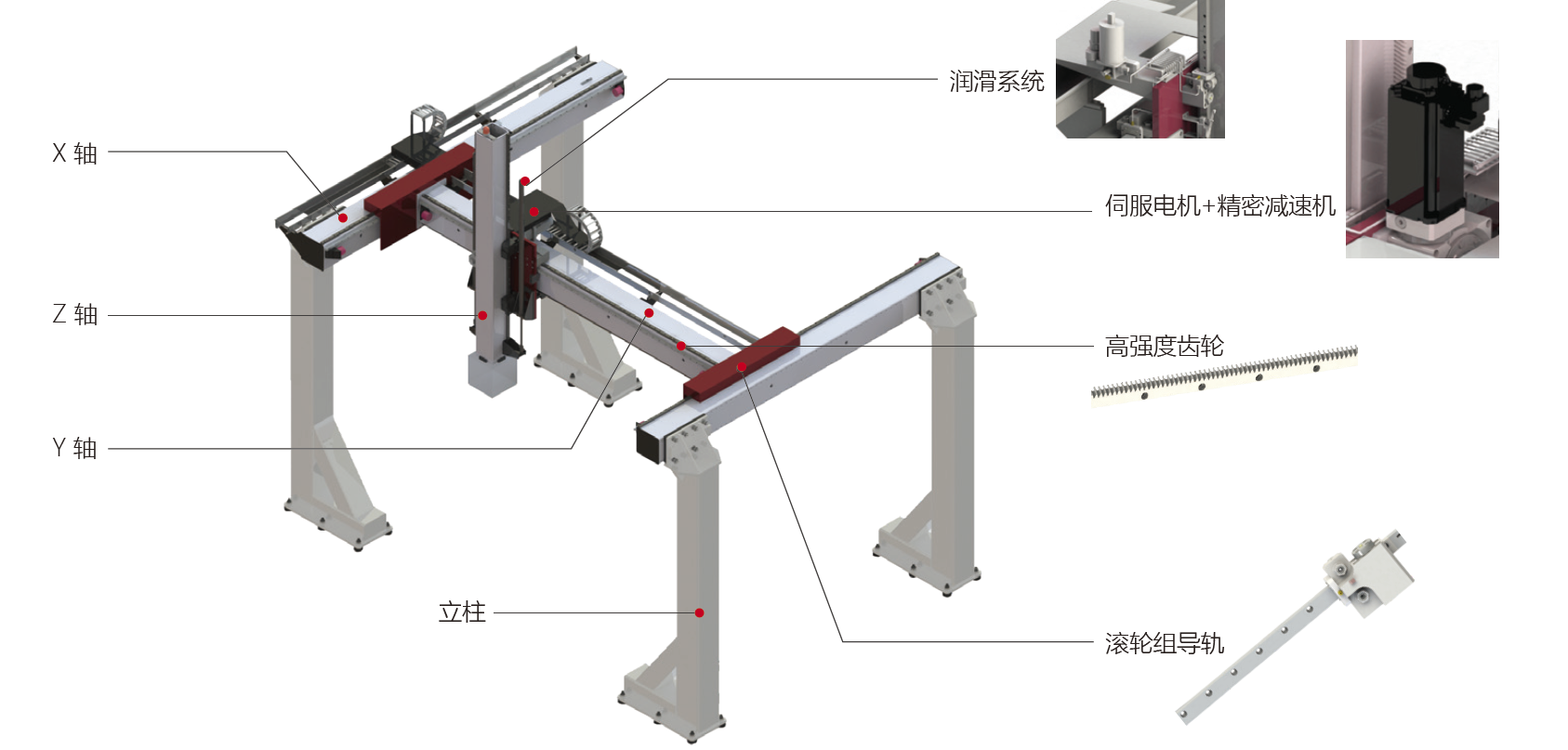直線式桁架機器人主要由立柱、Y軸、Z軸、Z軸末端夾具以及控制系統構成。